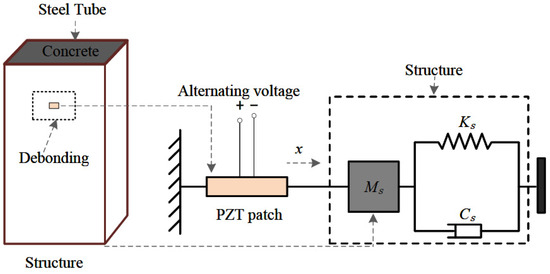 A one-dimensional PZT-structure coupling system was proposed by Liang [12], where only the axial compression deformation of the PZT patch and the interactions between the PZT patch and the host structure of CFST along the thickness direction of the PZT patch are considered. The electrical admittance of the EMI signal of the surface-mounted PZT sensor can be expressed as Equation (1).