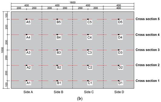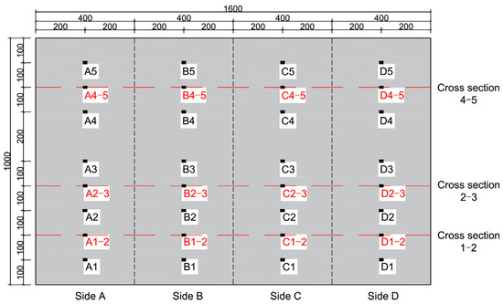 To validate the method proposed in this study for the detection of interface debonding defects and its localization, an interface debonding defect detection experiment is designed. Figure 4a shows the rectangular CFST specimen with surface-mounted PZT patches. The rectangular CFST member has a side length of 400 mm and a height of 1000 mm. The steel tube, made of Q235 grade steel with a thickness of 5 mm, is to be filled with concrete core of strength grade C30. The CFST specimen is divided into five cross sections at an interval of 200 mm in the vertical direction, labelled cross Section 1 to cross Section 5. Five PZT-5A patches are mounted on the four outer surfaces of the specimen, marked as A1~A5, B1~B5, C1~C5, and D1~D5 on Side A, B, C, and D, respectively. The arrangement of the sensors is shown in Figure 4b. It is worth noting that, before testing, the two sides with mimicked interface debonding defects are unknown.