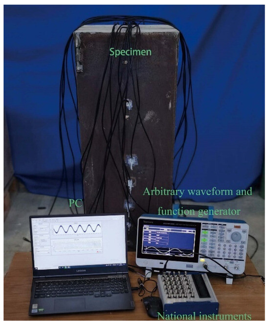 In this test, a waveform signal generator is used as the signal excitation terminal. The electrical signals of PZT sensors are collected through a dynamic data acquisition system, and then, the electrical signals of PZT sensors of different surface wave travelling paths are analyzed to preliminarily identify the range of potential interface debonding defects. Here, for the convenience of expression, the surface wave travelling path is defined in the form of PZT actuator–PZT sensor.