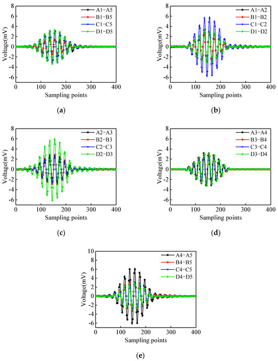 The output voltage signals of the surface-mounted PZT sensors excited by the 10-period sinusoidal windowed signal are shown in Figure 7. The output signal amplitude of the surface-mounted PZT sensors corresponding to the surface wave travelling paths of A1–A5, C1–C5, and D1–D5 are significantly higher than those of the path of B1–B5. Further measurements reveal that the output signal amplitude of the paths of C1–C2, D2–D3, and A4–A5 is also significantly higher than those of the remaining paths with an identical measurement distance. The results are consistent with the results of the surface wave measurements under the continuous sinusoidal excitation signals described above.