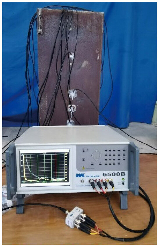 To more precisely localize the detected interface defects, EMI measurement is carried out. According to the results of the surface-wave-measurement-based interface debonding detection, additional PZT sensors are installed at the center of the surface wave travelling paths of 1–2, 2–3, and 4–5 on the Sides A, B, C, and D, and the additional PZT sensors are marked in red. The position and label of PZT sensors are shown in Figure 8. The impedance analyzer is used to apply high-frequency voltage excitation to PZT sensors for EMI measurement, and the impedance signals are obtained using the spontaneous and self-receiving characteristics of PZT sensors. The interfacial bonding state of the CFST specimen is judged by comparing and analyzing the impedance signals of the PZT sensors at different locations. Figure 9 shows the test setup of interface debonding defect detection based on the EMI technology.