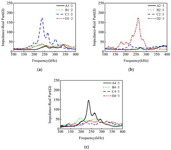 The impedance of PZT sensors at different measurement points: (a) Measurement points A1–2~D1–2; (b) Measurement points A2–3~D2–3; (c) Measurement points A4–5~D4–5.