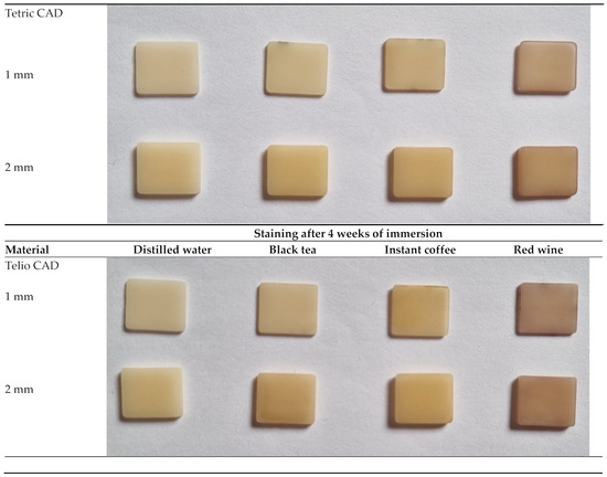 The daily use of various esthetic materials produced with CAD/CAM technology raises the question of how these materials react to external influences that affect their color change. Today’s high consumption of foods and beverages rich in natural and synthetic colorants can lead to the unsatisfactory esthetic performance of dental materials [9]. The discoloration of materials is a process that is influenced by several external and internal factors. The consumption of pigmented foods and beverages, poor oral hygiene, the use of colored chlorhexidine-based mouthwashes and smoking are among the extrinsic discoloration factors. Internal colors depend on the composition of the material and the size of the particles, as well as the absorption of water [10,11,12,13,14].