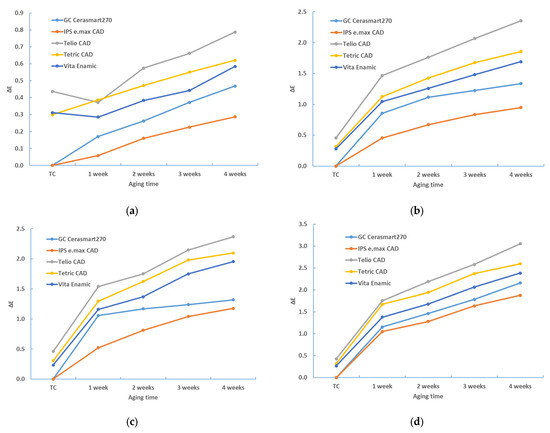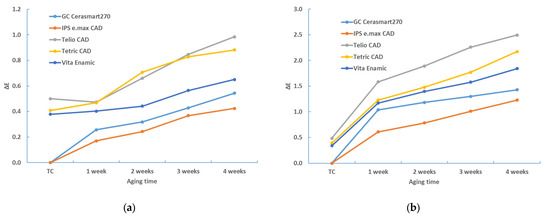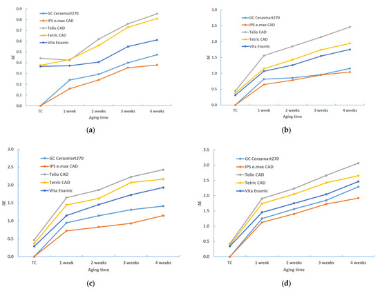 Stamenkovic et al. [36] evaluate the effects of staining and aging on the color changes of CAD/CAM nanoceramics, CAD/CAM polymer-infiltrated ceramic networks (PICNs) and CAD/CAM lithium disilicate ceramics. The results of this study suggest that lithium disilicate ceramics were more color stable than resin nanoceramics and PICN materials when stained with coffee and red wine. In addition, the results of color change after accelerated aging are similar to the current study.