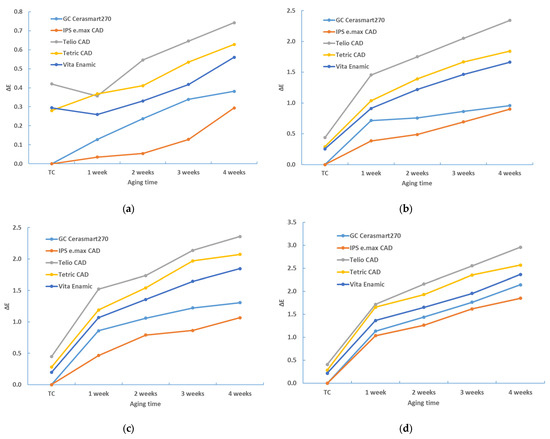 - Stamenković, D.D.; Tango, R.N.; Todorović, A.; Karasan, D.; Sailer, I.; Paravina, R.D. Staining and aging-dependent changes in color of CAD-CAM materials. J. Prosthet. Dent. 2021, 126, 672–678. [Google Scholar] [CrossRef] [PubMed]