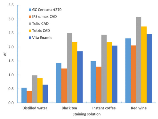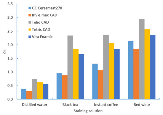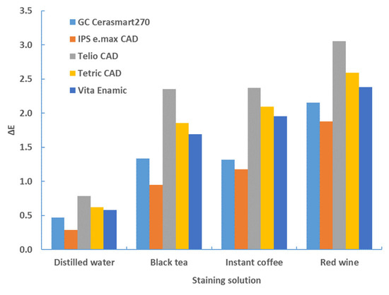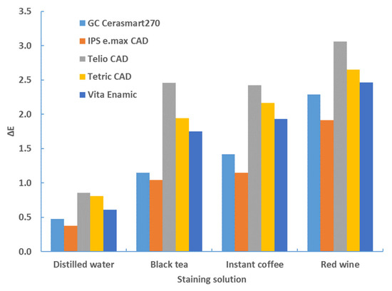 The comparison of the effects of the material type on the color change clearly shows the following sequence: Telio CAD > Tetric CAD > Vita Enamic > GC Cerasmart 270 > IPS e.max CAD, while the comparison of the influence of the staining solutions on the color change shows that red wine > instant coffee ≥ black tea > distilled water.