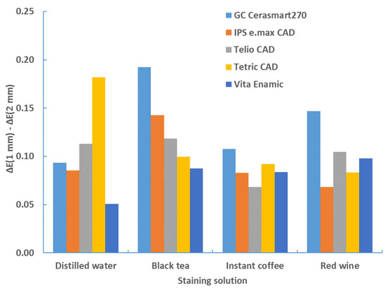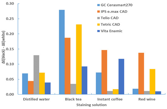 The same comparisons were made with the 2 mm thick samples. The results are the same; the order of material types and staining solutions remains unchanged (Table 9 and Figure 7 for white background and Table 10 and Figure 8 for black background).