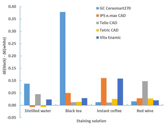 Similarly, a difference in color change for the white and black background was observed. The color change between two backgrounds is significantly different (p < 0.0001, ANOVA test; Table 6) and was taken into account. Table 7, Table 8, Table 9 and Table 10 show that the color change is greater with a black background. This comparison is clearly illustrated in Table 13 and Table 14 and Figure 12 and Figure 13. The difference in color change between the results on a black background and the results on a white background—expressed as ΔE*00 (black)–ΔE*00 (white)—was shown.