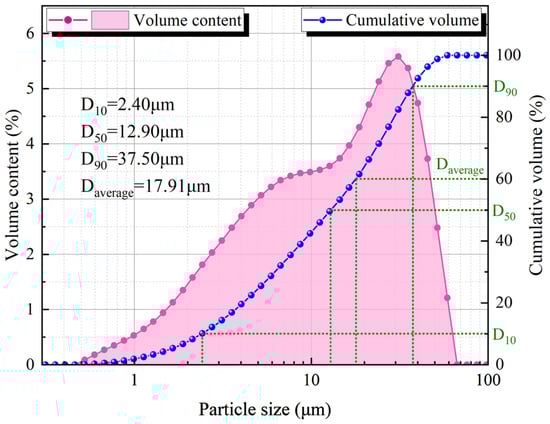 The tailings came from the Tiaoshuihe phosphate mine of Sanning Mining, the SS came from Guangxi Beibu Gulf Port Group, the ordinary Portland cement came from Changsha cement retail store, and the water was deionized water. The sieving method and laser particle size analyzer were used to analyze the particle size of the tailings and SS, and the results are shown in Table 1 and Figure 1. The chemical composition of SS was analyzed by X-ray fluorescence spectrometer (XRF) and X-ray diffraction (XRD), and the results are shown in Table 2.