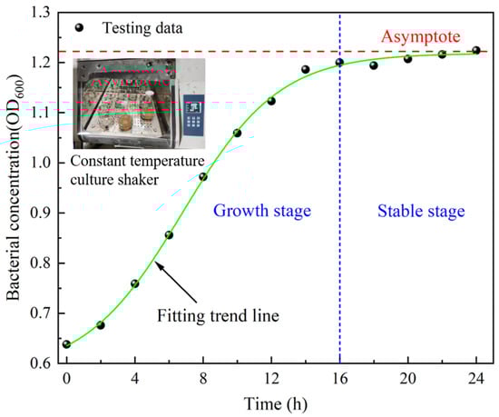 Studies have shown that Bacillus pasteurii is the most suitable microorganism for mine application [,,]. Microorganisms need to be cultured and expanded before use. The culture process is as follows: the microorganisms are transferred to the culture medium and then placed in a constant temperature shaker for culture; finally, the cultured bacterial solution is added to the backfill material. During the culture process, the optical density (OD) value of the bacterial solution is measured every 2 h by a visible spectrophotometer, and the results are shown in Figure 2. The bacterial solution includes two parts: microorganisms and culture medium. The ratio of culture medium is tryptone/soy peptone/sodium chloride/urea/water = 3:1:1:4:200.