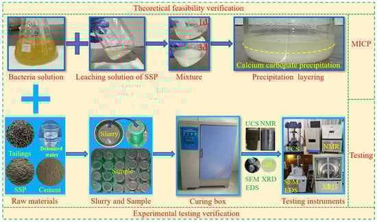 In this experiment, tailings were used as aggregate, cement as cementitious material, and SS as a microbial calcium source. The preparation and curing processes of the backfill sample are as follows: First, the raw materials were mixed into slurry according to the ratio, and the slurry with different ratios was made into standard samples using φ50 mm × 100 mm cylindrical molds. The samples were labeled as A0–A4 according to the proportion of bacterial solution in the mixed solution—12 samples in each group; a total of 60 samples. The mixed solution includes bacterial solution and deionized water. The proportion of bacterial solution in the mixed solution is 0%, 25%, 50%, 75%, and 100%, respectively. The cement/sand ratio is 1:4 and the mass concentration is 80%; SS accounts for 28% of the total SS and tailings. The prepared samples were put into the curing box for curing, and all tests were carried out on the 3rd and 7th day of sample curing. The experimental process is shown in Figure 3.
