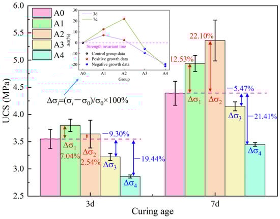 where Δσi represents the strength growth rate (%), σi represents the strength of each group (MPa), and σ0 represents the strength of group A0 (control group) (MPa). The strength growth rate is calculated according to Formula (1), and the result is shown in Figure 4. The strength growth rates of groups A1 and A2 are both positive, indicating that the bacterial solution has a beneficial effect on strength. The strength growth rates of groups A3 and A4 are both negative, indicating that excessive addition of bacterial solution is harmful to strength.