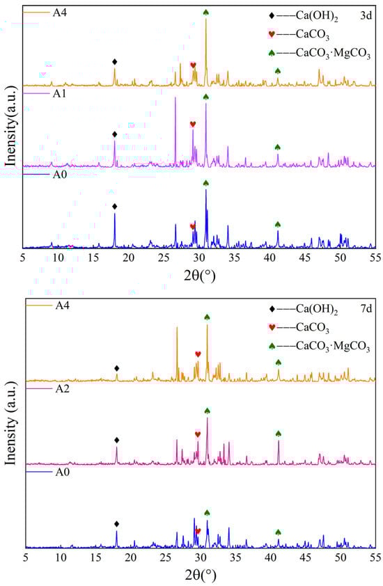 XRD, as a commonly used method for substance composition testing, was used to test the substance composition of backfill materials with different bacterial solution content, and the results are shown in Figure 5. As can be seen from Figure 5, Ca(OH)2 content gradually decreases with the increase in bacteria solution content at 3 d, indicating that Ca2+ was consumed by microorganisms. However, the CaCO3 content first increases and then decreases, while the content of dolomite increases, indicating that when the CaCO3 content reaches a certain concentration, it will convert to dolomite. A similar law appeared at 7 d. According to the principle of MICP technology, the related reaction equations are as follows [,]: