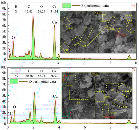 Figure 6 shows SEM and EDS images magnified 5000 times at 3 d and 7 d. Products with various morphologies can be clearly seen from the SEM images, and the structural composition can be determined according to the morphologies of the products. According to the research results of other scholars, it can be determined that the needle-shaped crystal is AFt, the gel state is C-S-H, and the layered structure is CH []. However, the crystal structure of CaCO3 is uncertain, and there are usually three crystal structures: aragonite, vaterite, and calcite, which have needle shaped, spherical, and diamond shaped morphologies, respectively []. It can be seen from Figure 6 that most products are AFt and C-S-H, because cement and SS contain a large number of C2S, C3S, and C3A. According to the hydration reaction equation [,], their hydration products are AFt and C-S-H. Due to different calcium sources, the morphology of CaCO3 is also different []. EDS technology was used to detect that the morphology of CaCO3 with SS as a calcium source is similar to that of vaterite. Comparative analysis of hydration products between different groups at different ages showed that group A0 had more AFt than group A2, but no CaCO3 was found in group A0. This is because Ca2+ in group A2 is consumed by microorganisms after adding bacterial solution, which hinders the formation of Aft but produces CaCO3.