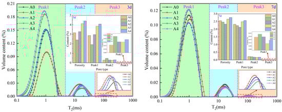 Figure 7 shows the pore distribution characteristics of the backfill material at 3 d and 7 d. It can be seen from Figure 7 that the NMR spectra at both ages contain three peaks, indicating that there are three types of pores in the backfill material. According to the relationship between pore size and T2 [,], the three peaks can be divided into three categories based on pore size—large, medium, and small—with peak 1 being a small pore, peak 2 being a medium pore, and peak 3 being a large pore. In terms of content, the content of small pores is the greatest, and the content of large pores is the least. As the bacterial solution content increases, porosity and small pore content first decrease and then increase. This is because when the bacterial solution content reaches a certain amount, both microbial mineralization and hydration reactions are optimum, resulting in the best filling effect of the product and the smallest porosity. However, as the bacterial solution content increases, microbial mineralization continuously consumes Ca2+, leading to weakened hydration reactions. Moreover, the filling effect of mineralization products is not as good as that of hydration products, resulting in an increase in porosity.