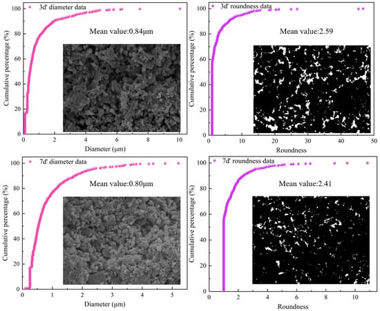 SEM can observe not only the microstructure but also the pore characteristics. When the magnification is low, pore distribution characteristics can be observed. Since it is difficult to distinguish between pores and solids by direct observation of SEM images, binarization processing is needed, and then digital image processing technology is used to obtain the parameter characteristics of pores. The results are shown in Figure 8 and Table 3. It can be seen from Figure 8 that the pore size of 70% of the pores is smaller than the average value, indicating that the pore size of most of the pores is small, which corresponds to the results of NMR. The roundness value of the pores is greater than 1.65, indicating that most pores are irregular. It can be seen from Table 3 that the pore parameter values at 7 d are all smaller than those at 3 d. This is because as the curing age increases, hydration reactions and microbial mineralization continue to occur, and the products fill the pores, causing them to become smaller and relatively regular.
