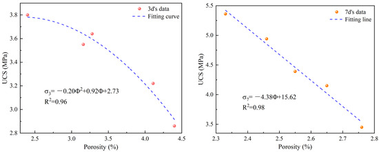 MICP has a significant influence on the porosity of the backfill material, and there is a certain relationship between porosity and strength. Therefore, the relationship between the porosity and strength of backfill materials with different bacterial solution contents was established, and the results are shown in Figure 9. It can be found from the figure that there is a good relationship between them (R2 > 0.96), and they conform to the inverse proportional relationship, which can be expressed as follows: