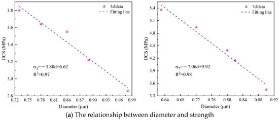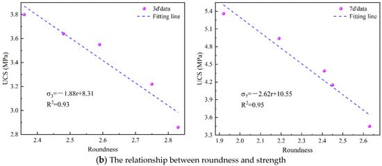 where d represents diameter (μm) and r represents roundness. It can be seen from Formulas (7) and (8) that the strength decreases with the increase in pore shape parameters. This is because the larger the pore size, the worse the support effect of the solid phase, and, thus, the lower the strength. Roundness represents the regularity of the pores, and the smaller the roundness, the more regular the pores. The more regular the pores, the higher the strength. Therefore, there is an inverse relationship between strength and roundness, which is consistent with the experimental results.
