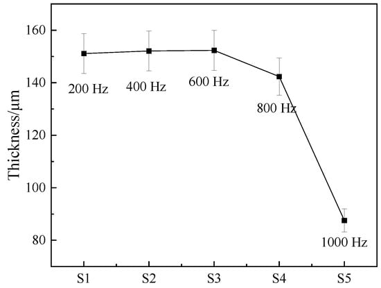 - The low frequency has little effect on the thickness of the coating. With the increase in frequency, the monopulse discharge energy continues to decrease, and the coating thickness decreases significantly, and it reaches the lowest level at 1000 Hz. With the increase in frequency, the pore size of the discharge on the surface of the coating decreases and the surface tends to be smooth and flat.