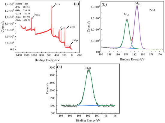 - The coating is mainly composed of the monoclinic phase (m-ZrO2), tetragonal phase (t-ZrO2), and SiO2 phase. The binding energies of Zr are 181.38 eV (3d3/2) and 183.58 eV (3d5/2). The oxidation coating is mainly composed of the Zr, O, and Si elements.