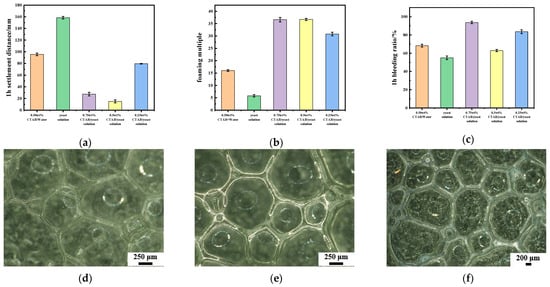 The 1 h settlement distance (a), average foaming multiple (b) and bleeding ratio (c) of the foaming agent; the morphology of the bio-based foaming agent when the CTAB content is 0.25 wt% (d), 0.50 wt% (e) and 0.75 wt% (f), respectively.