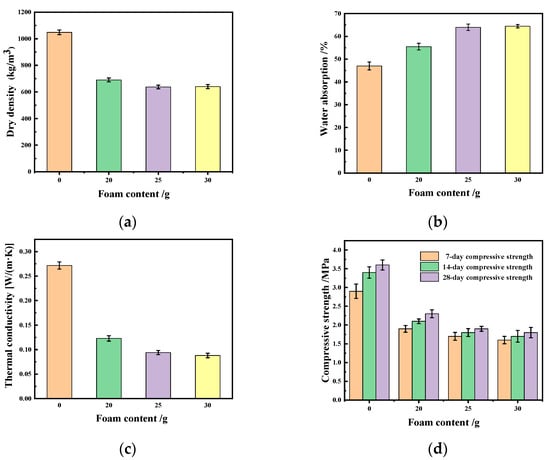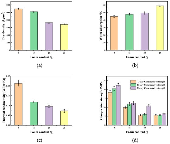 In order to fully prove the universality of the bio-based foaming agent for the preparation of lightweight geopolymers, fly ash was used instead of silica fume in the experiment. The dry density reached 1107.3 kg/m3 without adding foam, and the dry density decreased gradually to 1023.8 kg/m3, 730.0 kg/m3 and 678.4 kg/m3, respectively, when the content of foam was 15 g, 20 g and 25 g (Figure 4a). The water absorption of the fly ash-based geopolymer increases, and the thermal conductivity decreases with the increase in foam content (Figure 4b,c). As shown in Figure 4d, the compressive strength of the samples gradually decreases with the increase in foam content, and increases with the growth in curing age. The dry densities of a lightweight geopolymer prepared using foaming agents such as a synthetic surfactant and plant surfactant are around 630 kg/m3, and the compressive strength is between 1.86 MPa and 2.66 Mpa. A lightweight geopolymer prepared with foaming agents such as nanometer aluminum oxide, synthetic surface, plant surface, aluminum powder, etc., has a dry density of around 600 kg/m3 and a compressive strength of 1.83 MPa–2.75 Mpa [24,25,26]. Our work uses a bio-based foaming agent, mixed with yeast solution and CTAB, to reduce the dry density of a fly ash-based lightweight geopolymer to 678.4 kg/m3, but the compressive strength remains around 6.4 Mpa.