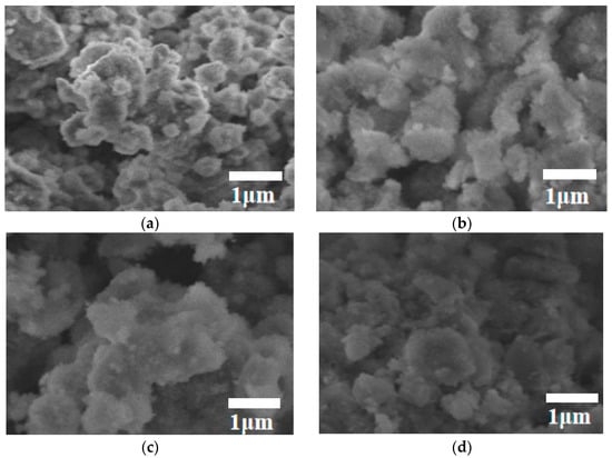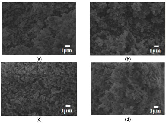 A large number of fibrous cementitious materials accumulate into a near-spherical structure as shown in Figure 5a–d. This is because the Si-O-Al covalent bond of highly active metakaolin is firstly destroyed in the reaction process, it combines with alkaline substances to form a gel, which attaches to the surface of spherical fly ash particles. As the degree of carburization deepens and the degree of polymerization increases, the nearly spherical particles gradually become larger, and the density of the structure gradually increases. Finally, a unique three-dimensional network structure is formed, forming the framework of fly ash-based geopolymers.