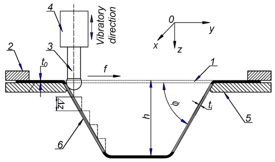 Figure 1 illustrates a schematic of the ultrasonic-assisted incremental sheet-forming (UISF) process. The initial workpiece (1) with thickness t0 is clamped between blank holder (2) and back plate (5). Strategy Geometry/shape of the forming tool (3) was selected in accordance with the product profile (e.g., forming depth h and wall angle ϕ) to be shaped by using a CNC machine or robotic arms with the tool path programmed based on the part profile and generated by the CAD/CAM program [4]. To form the full depth h, the tool advances axially in steps with step-down size Δz and moves in horizontal direction with feed rate f. The tool usually has a hemispherical-head tool with a diameter commonly ranging from 5 mm to 20 mm [7,62]. In UISF process, the tool is connected to an ultrasonic transducer (4), which makes it vibrate in the vertical direction. At the end of the processing process, the final product (6) with thickness ti is received. It should be noted that the tool may or may not rotate. Previous studies show that the rotation speed of the tool has almost no effect on the forming force components [49,52,63]. In this study, the forming tool was selected not to rotate in all experiments.