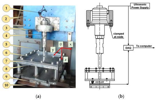 Practical experimental setup: (a) a front view and (b) transducer clamping diagram and model for collecting experimental parameters: (1) ultrasonic supply; (2) head of CNC machine; (3) clamp; (4) ultrasonic transducer; (5) forming tool; (6) workpiece plate; (7) blank holder; (8) back plate; (9) Kistler 3-component dynamometer; (10) table bed of machine.