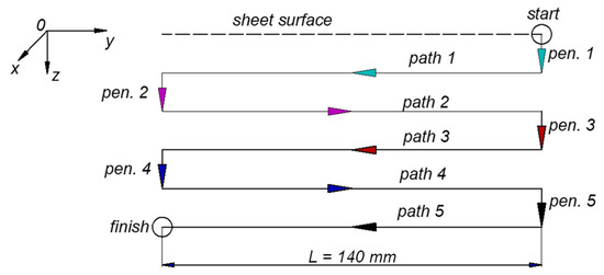As shown in Figure 3, at the beginning of the forming process, the tool penetrates the sheet surface by a step-down Δz (in the vertical direction Oz), then moves horizontally Oy at a certain feed rate f (see the coordinate system in Figure 1). This process is repeated five times to create a straight groove. During the experiment, ultrasonic vibrations are supplied to the tool through the transducer in on/off mode to evaluate the influence of applying ultrasonic assistance. The deformation force components Fz (in vertical direction), Fy (in the horizontal direction of the forming tool), and Fx and the electrical signal supplied to the transducer are recorded for processing.