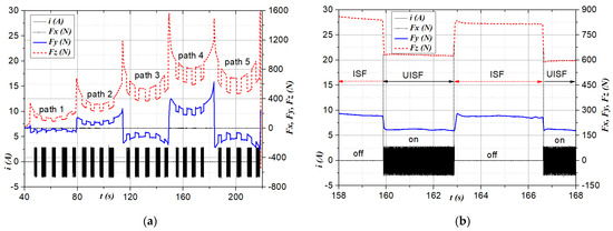 where FzISF and FyISF are the average forming forces when turning off ultrasonic vibration, and FzUISF and FyISF are the average forming forces when turning on ultrasonic vibration, respectively. In this study, the values of force components FzISF, FzUISF, FyISF, and FyUISF are calculated as the average values in the middle of each path, when the ultrasonic vibration is turned off and turned on, respectively.