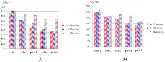 Figure 6 and Figure 7 present typical statistical results of RFzi (%) and RFyi (%) in five paths under some specified conditions, respectively, in which RFzi (%) and RFyi (%) are calculated according to Equation (2) and Equation (3), respectively (see Section 3.3 below). These two figures show that the greater the thickness, the lower the effectiveness of RFzi (%) and RFyi (%). Figure 6 shows that with different feed rates, RFzi (%) is significantly different. The larger the feed rate, the greater the Fz force reduction effect. As depicted in Figure 6a, for the smaller thickness, after each path, RFzi (%) tends to decrease. At low feed rates (i.e., f = 200 mm/min and f = 700 mm/min), the decreasing trend of RFzi (%) is larger than that at high feed rate (f = 1200 mm/min). However, for the thickness of 1.0 mm, as shown in Figure 6b, the decreasing trend of RFzi (%) after each path at feed rates of 700 mm/min and 1200 mm/min is not clear. This can be explained because when the feed rate is raised, the heat from contact friction between the surface of the plate and the tool increases, making the material softer [62]. The Fy force reduction effect during five paths, as depicted in Figure 7, also shows the same trend as Fz force reduction.