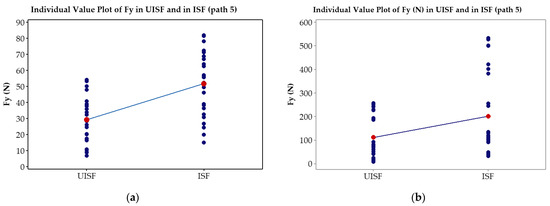 Paired T-test plots Fy in UISF and in ISF processes: (a) 0.5 mm in thickness and (b) 1.0 mm in thickness.