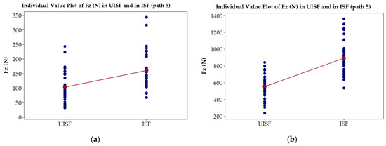 Paired T-test plots Fz in UISF and in ISF processes: (a) 0.5 mm in thickness and (b) 1.0 mm in thickness.