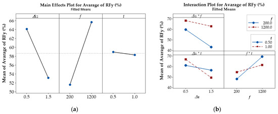 The results shown in Figure 10a indicate that the feed rate parameter, f, has the highest effect on the average of RFy, as shown by the steep slope increases. As the feed rate f increases, the average of RFy also increases, which implies that the effectiveness of ultrasonic vibration is reduced as the RFy tends to increase; i.e., larger feed rates result in greater effectiveness of ultrasonic vibration in reducing the RFy. On the other hand, both the step-down size Δz and the thickness t tended to decrease RFy as the parameter value increased. The impact of step-down size Δz on the RFy is slightly less significant than that of feed rate f, but the degree of influence of the sheet thickness parameter, t, is relatively low, as indicated by the shallow slope.