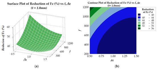 The results in Figure 12 and Figure 13 show that the RFz (%) is larger when the step-down size Δz is small and the feed rate f is high. This phenomenon is because, under the effect of ultrasonic vibration, the temperature at the contact area between the tool and workpiece increases, softening the material and facilitating easier flow [47,48,62]. The higher the feed rate, the greater the heat generated due to contact friction, enhancing the effectiveness of ultrasonic vibration in reducing Fz force. With both the sheet thicknesses of 0.5 mm and 1.0 mm, at a step-down size of 0.5 mm, a force reduction RFz (%) of about 60% can be obtained with feed rates f ranging from 1150 mm/min to 1200 mm/min.