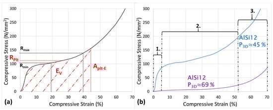 (a) Example of a characteristic stress–strain curve for metal foams and corresponding parameters according to DIN 50134:2008-10 [6]; (b) example of the mechanical behavior of aluminum foams with different porosities and under quasi-static compressive loading. The numbers 1–3 refer to the 3 stages of deformation described on page 1.