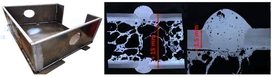 In this method, an aluminum alloy is initially melted, thickened by adding metal powders, foamed by adding a blowing agent, and then cooled to solidify [8] (p. 14). Commonly used blowing agents include metal hydrides (TiH2, ZrH2—releasing H2) or carbonates (CaCO3, dolomite—releasing CO2). For increasing the viscosity of the molten aluminum, substances such as Ca or Al2O3 are used [4]. Using melt metallurgical methods, it is also possible to produce molded parts from Al foam (analogous to standard casting processes), but this is only economically viable for large-scale production. Aluminum foams are particularly prevalent as sandwich composites with solid aluminum or steel cover sheets. Here, the so-called powder metallurgical route is employed. A powder mixture of Al alloy, blowing agent, and pore-stabilizing agents (e.g., Al2O3) is initially pressed into a foamable semi-finished product and placed between the cover sheets. Subsequent heat treatment causes the semi-finished products to foam and simultaneously form a metallic bond with the cover sheets [9]. With this technology primarily two-dimensional components (sheets) or profile structures can be produced cost-effectively. These sandwich panels can then be processed, e.g., via MIG welding (for example, see Figure 2).