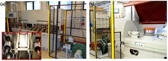 (a) Metal-cored wire machines at the BTU Cottbus-Senftenberg; (b) wire drawing machine at the BTU Cottbus-Senftenberg.