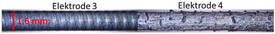 Electrodes 3 and 4 were produced using a continuous powder extrusion process (trade name TEMCONEX® by Neue Materialien Fürth GmbH, Furth, Germany) through the Leichtmetallkompetenzzentrum Ranshofen GmbH (Braunau am Inn, Austria). With this method, metal in powder form can be continuously processed into a solid profile. The process is used, among other things, to produce foamable semi-finished products for the manufacture of aluminum foam sandwich panels. Therefore, the production of foamable aluminum welding wire electrodes is closely related to this method. For the production of the electrodes, powder mixtures of Al, Si, and Mg, and a defined proportion of the blowing agent TiH2, were prepared and pressed into wires with a diameter of 1.6 mm and a length of approximately 5 m. Depending on the size of the powder, an irregular surface structure was created, which must be taken into account during the welding processing (see Figure 4).