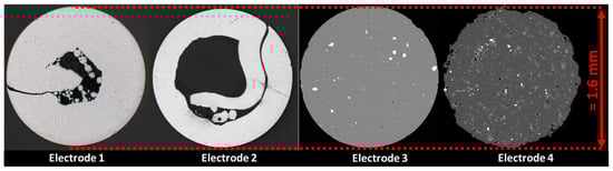 In Figure 5 cross-sections of the 4 electrodes compared in this publication are depicted. The composition of the electrodes is summarized in Table 2. Due to the preparation, the powder from the cored wire electrodes has partially leaked out and is no longer fully visible in the cross-section.