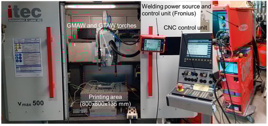 The wire electrodes depicted in Figure 5 and Table 2 were processed using a Metal Inert Gas Welding (MIG) process. The equipment used is shown in Figure 6. The figure displays the CNC-controlled test setup equipped with a MIG power source (Fronius CMT Advanced 4000 (Fronius International GmbH, Wels, Austria)). The welding power source was thereby used for process control and the recording of the welding voltage/welding current.