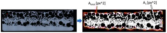Porosity is one of the key parameters for characterizing a foam structure. Depending on the sample, two methods were applied for porosity determination. With the electrodes shown in Table 2, single-layer weld overlays were first welded onto an AlMg3 sheet substrate to determine the porosity P2D in the weld metal based on cross-sectional images (plane of the image parallel to the welding direction). Samples of 30 mm in length were taken from the approximately 100 mm long weld beads at the midpoint. To quantify the porosity in cross-sectional images (in 2D), the open-source image processing software ImageJ2 1.53q with the image processing package Fiji were used (available at [24]). As shown in Figure 7 and Equation (5), ImageJ can be used to calculate an area ratio between the total area of the weld Atotal and the area of solid aluminum A1.