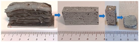 The mechanical properties of the foams were determined according to DIN 50134, as described. Initially, the average pore diameter was calculated using the ImageJ 1.53q software based on cross-sectional images. The foam blocks were then cut into test specimens with standardized dimensions using a wet cutting grinding machine and compressed up to 80% at a compression rate of ė = 5 × 10−3 s−1 using a universal testing machine. The sample preparation process is shown in Figure 8).