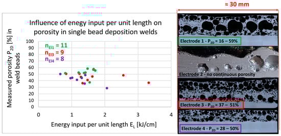 Longitudinal cross-sections of high porosity deposition weld beads with corresponding porosity value–examples and influence of energy input per unit length EL.