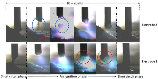It is noticeable that three out of the four processed electrodes delivered similar porosity results, even though electrode 1 had a significantly higher blowing agent content (3.3%) compared to electrodes 3 and 4 (each 0.8%). One possible explanation is the observed powder loss during the welding of the metal-cored wire electrodes. With electrode 2, although porous welds could be produced, the pore distribution and the seam geometry were so irregular that a more detailed evaluation was waived. Electrode 4 showed a slight decrease in porosity when increasing EL. However, due to high process fluctuations and a small sample size, no correlation should be assumed here. Recordings with a high-speed camera showed that the energy reduced short arc process could not be reliably implemented with electrode 2. In the arc ignition phase, the sheath of the cored wire partially melted away, abruptly exposing the powder before the directed droplet transfer could occur during the short circuit (see blue circles in Figure 10). This effect was not observed with the extruded electrodes. Here, it was observed instead that the droplet “boils” during the arc phase and then transitions directionally into the molten pool (see red circles in Figure 10).