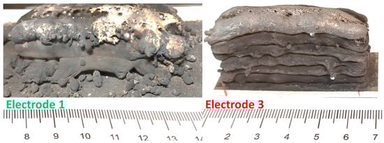 With electrodes 1, 3, and 4, additive block structures made of aluminum foam were produced and their behavior under compressive load was tested according to DIN 50134:2008-10. Similar to the previously described experiments no significant and uniform porosity could be achieved with electrode 2. It was also observed that only the electrodes produced by powder extrusion (3 and 4) were well-suited for multi-layer welding. Electrode 1 (metal-cored wire) tended to produce excessive spattering, powder loss, and deposition of oxides on the weld seam surface during multi-layer build-up (see Figure 11). However, this effect could likely be counteracted by optimizing the characteristic curve and the welding parameters.