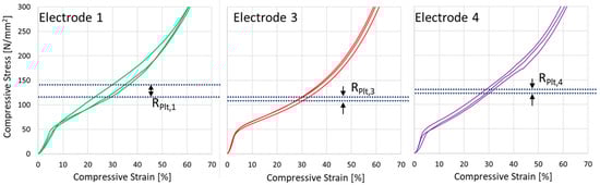 Mechanical behavior of additively manufactured aluminum foams under uniaxial compression (according to DIN 50134:2008-10) and respective plateau stress RPlt (see also Table 4).