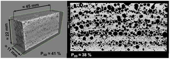 CT-Scan of additively manufactured aluminum foam block (electrode 3) with corresponding porosity in three and two dimensions.