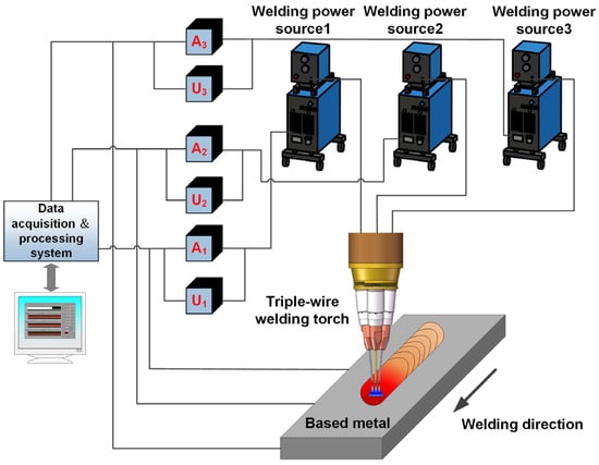 The welding equipment mainly consisted of the welding system and data acquisition system, as shown in Figure 2. The welding system primarily included three pulse welding power sources, a specially designed triple-wire welding torch, and a welding travel mechanism. The welding torch mainly consisted of three mutually insulated wires arranged in an equilateral triangle distribution, and each wire was powered by a separate welding power source. The flux-cored wire was positioned in the front as a guide during the welding process, while the two solid wires followed behind. The data acquisition system mainly consisted of an electrical signal acquisition system and a high-speed photography system. The electrical signal acquisition system monitored changes in electrical signals during the welding process, such as pulse current and voltage. The high-speed photography system monitored the arc behavior and metal transfer process. The corresponding relationship between the arrangement of the three wires and their positions in the high-speed photograph is illustrated in Figure 3. Starting from right to left, the first wire was the flux-cored wire, corresponding to the electrical signals UFCW and IFCW. The second wire was solid wire 2, corresponding to the electrical signals USW2 and ISW2. The third wire was solid wire 1, corresponding to the electrical signals USW1 and ISW1.